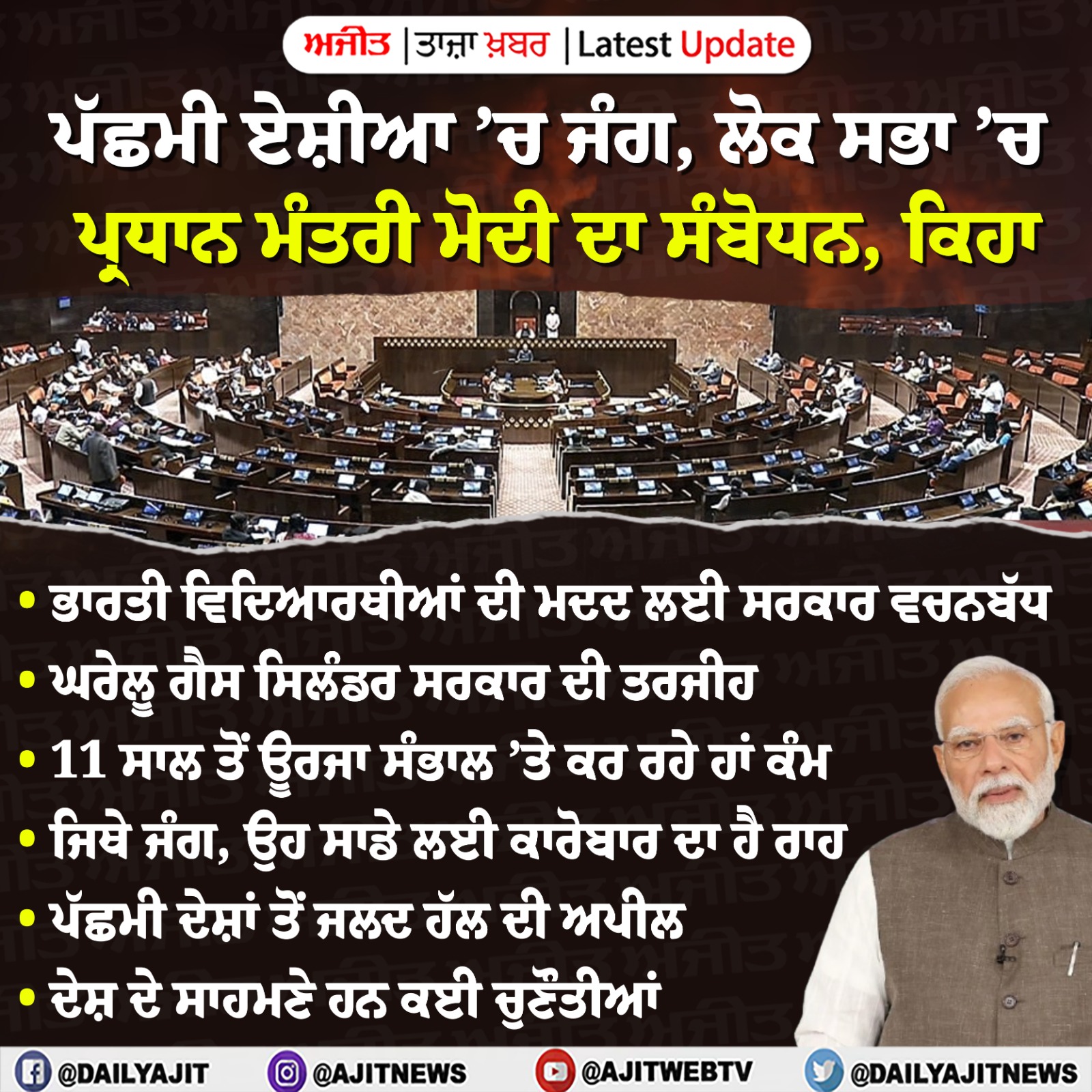 ਪੱਛਮੀ ਏਸ਼ੀਆ ਸੰਘਰਸ਼ ਸੰਬੰਧੀ ਅੱਜ ਲੋਕ ਸਭਾ ’ਚ ਬੋਲਣਗੇ ਪ੍ਰਧਾਨ ਮੰਤਰੀ ਮੋਦੀ