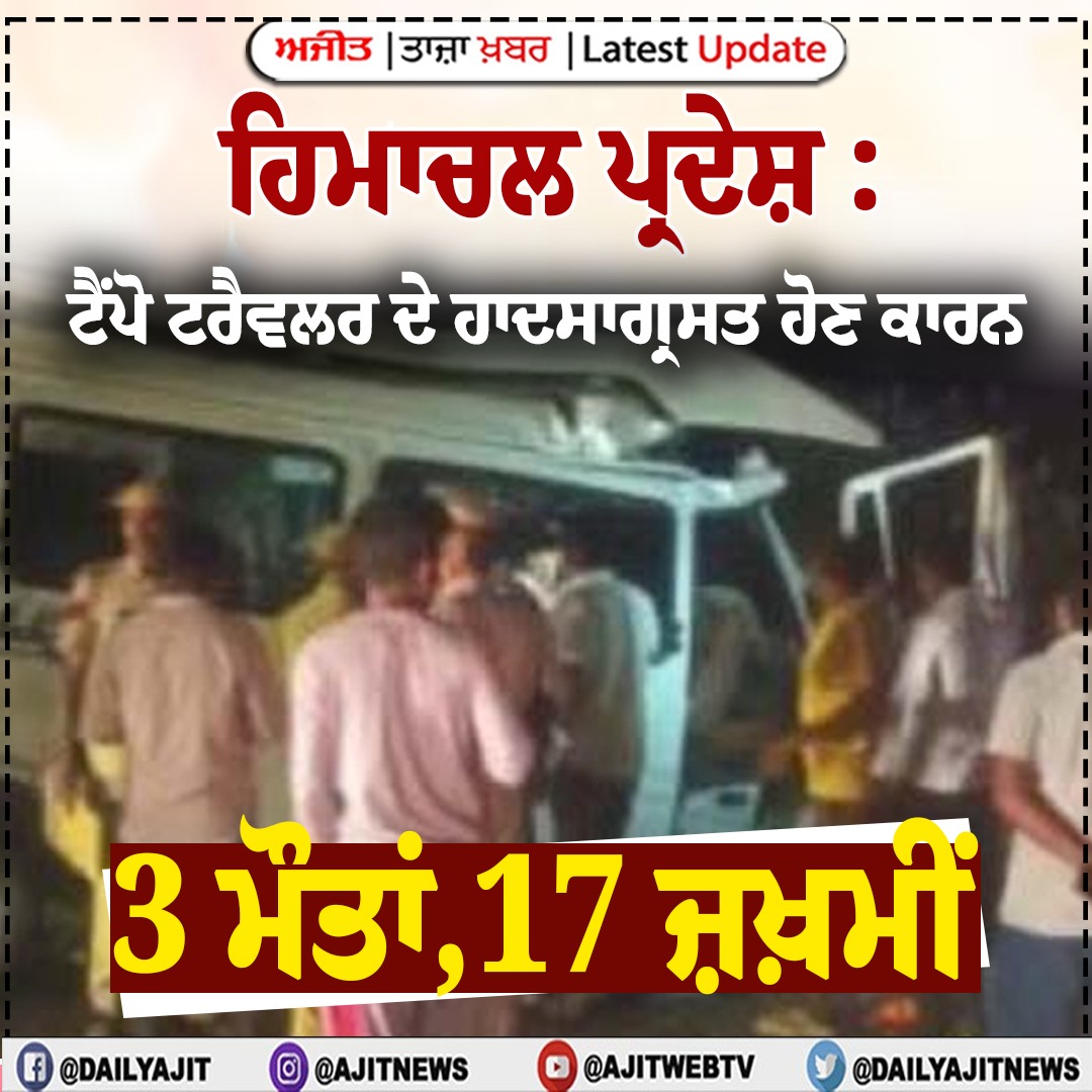 3ਹਿਮਾਚਲ ਪ੍ਰਦੇਸ਼ : ਟੈਂਪੋ ਟਰੈਵਲਰ ਦੇ ਹਾਦਸਾਗ੍ਰਸਤ ਹੋਣ ਕਾਰਨ 3 ਮੌਤਾਂ, 17 ਜ਼ਖ਼ਮੀਂ