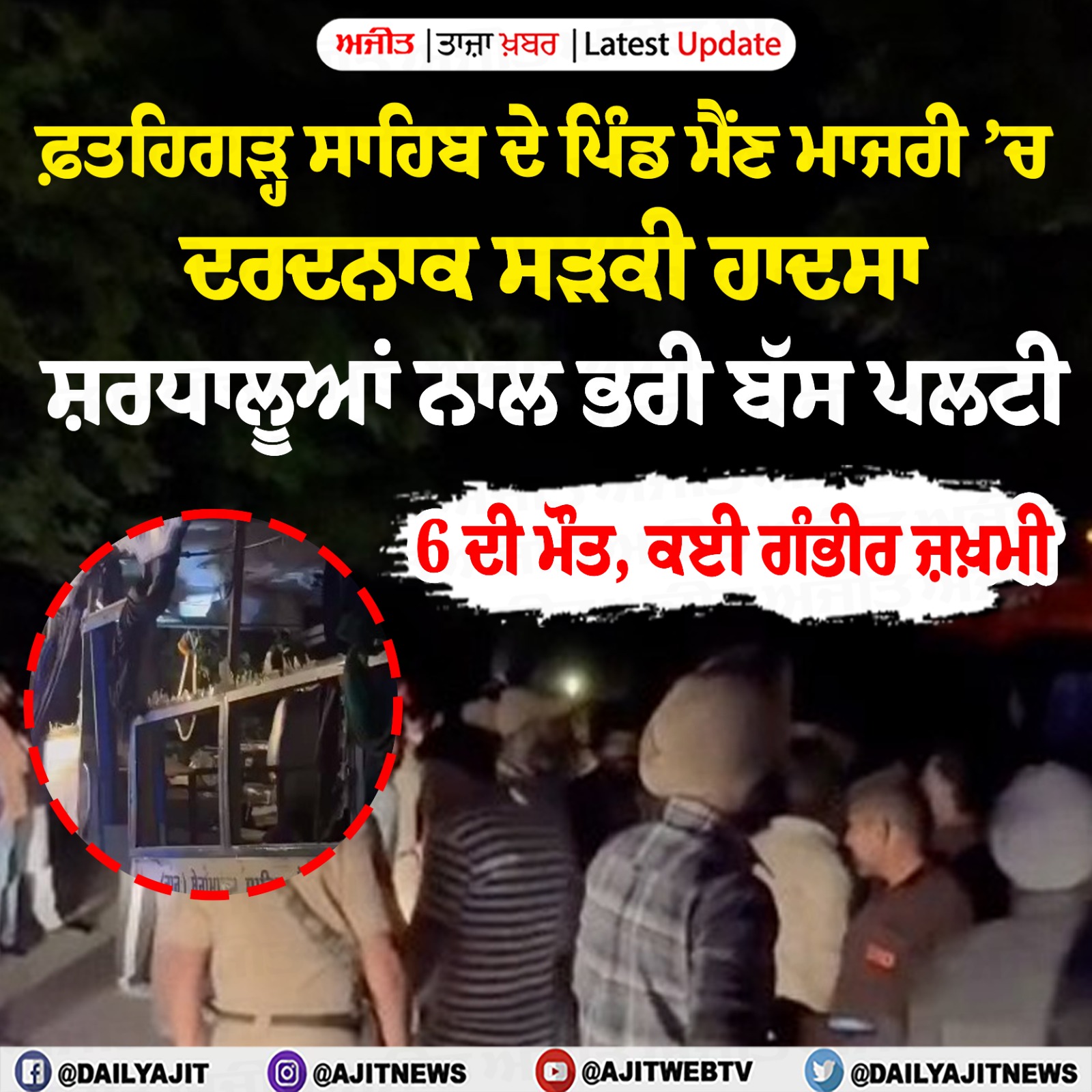 ਫ਼ਤਹਿਗੜ੍ਹ ਸਾਹਿਬ, 15 ਅਪ੍ਰੈਲ (ਬਲਜਿੰਦਰ ਸਿੰਘ)- ਫਤਿਹਗੜ੍ਹ ਸਾਹਿਬ ਵਿਚ ਸ਼ਰਧਾਲੂਆਂ ਨੂੰ ਲੈ ਕੇ ਜਾ ਰਹੀ ਇਕ ਬੱਸ ਪਲਟ ਗਈ। ਇਸ ਵਿਚ ਛੇ ਸ਼ਰਧਾਲੂਆਂ ਦੀ ਮੌਤ ਹੋ ਗਈ ਅਤੇ 15 ਜ਼ਖ਼ਮੀ ਹੋ ਗਏ। ਜ਼ਖ਼ਮੀਆਂ ਵਿਚ ਔਰਤਾਂ ਅਤੇ ਬੱਚੇ ਸ਼ਾਮਿਲ ਹਨ। ਉਨ੍ਹਾਂ ਨੂੰ ਤੁਰੰਤ ਨੇੜਲੇ ਹਸਪਤਾਲਾਂ ਵਿਚ ਦਾਖ਼ਲ ਕਰਵਾਇਆ ਗਿਆ ਅਤੇ ਉਨ੍ਹਾਂ ਦਾ ਇਲਾਜ ਚੱਲ ਰਿਹਾ ਹੈ। ਬੱਸ ਵਿਚ 40 ਸ਼ਰਧਾਲੂ ਸਵਾਰ ਸਨ। ਇਹ ਘਟਨਾ ਕੱਲ੍ਹ ਦੇਰ ਰਾਤ ਵਾਪਰੀ।
