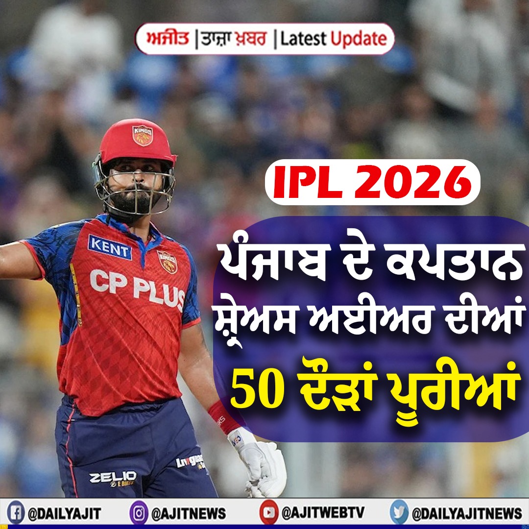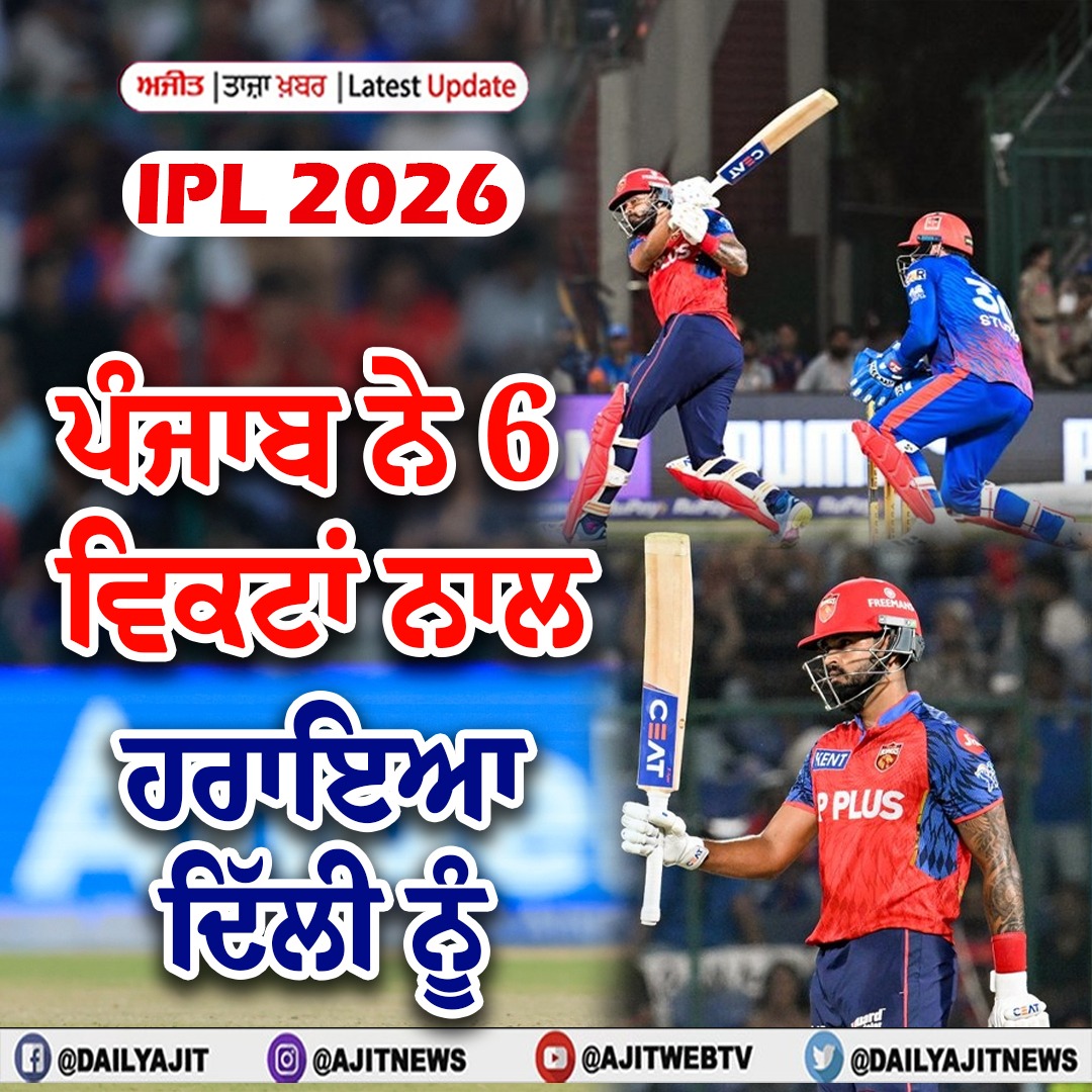 ਤਾਜ਼ਾ ਖ਼ਬਰਾਂ ਆਈ.ਪੀ.ਐੱਲ 2026 : ਪੰਜਾਬ ਕਰਾਰਾ ਜਵਾਬ, 5.2 ਓਵਰਾਂ 'ਚ ਬਿਨਾਂ ਕਿਸੇ ਨੁਕਸਾਨ ਦੇ 100 ਦੌੜਾਂ ਪੂਰੀਆਂ 2 hours 22 minutes ago