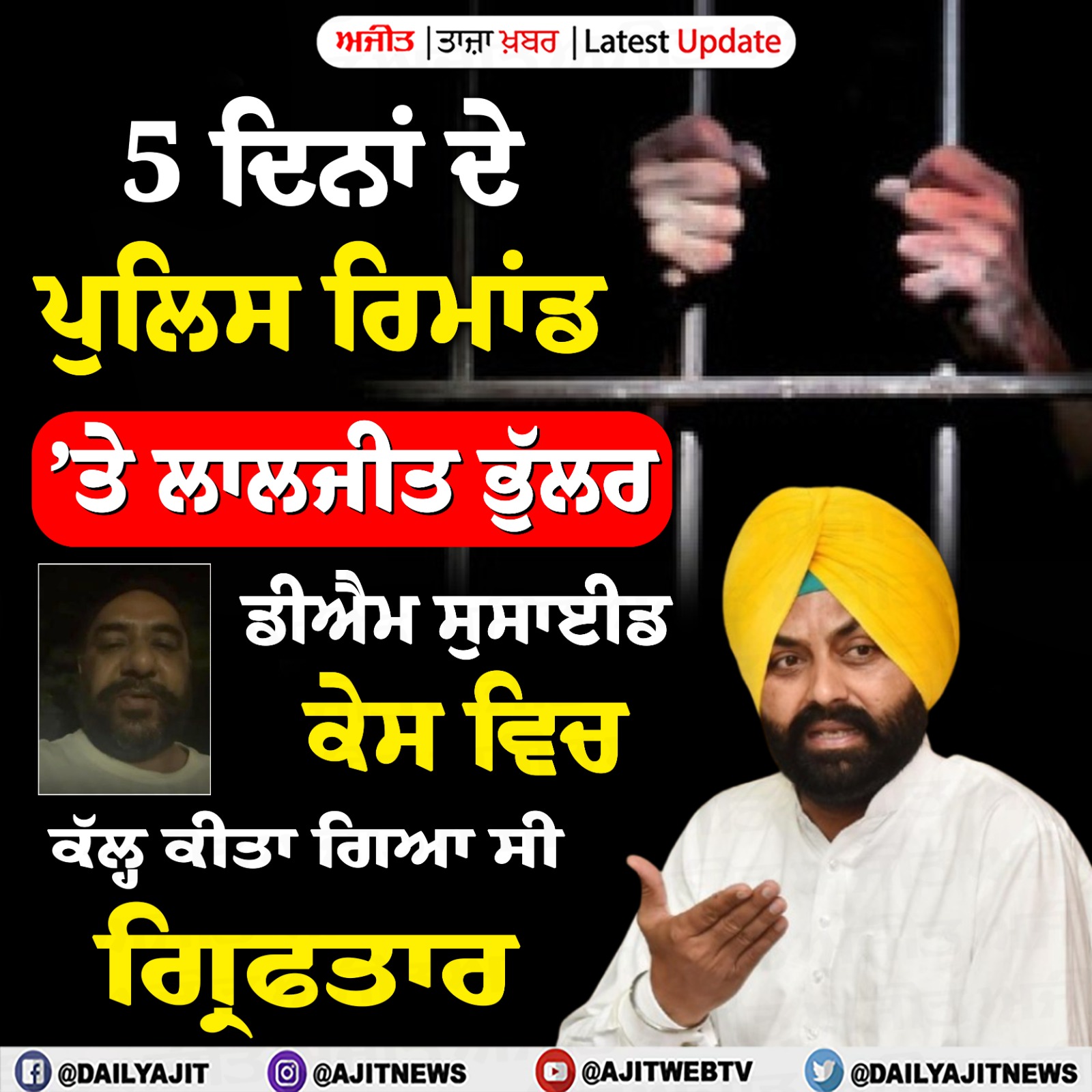 ਅੰਮ੍ਰਿਤਸਰ , 24 ਮਾਰਚ- ਪੰਜਾਬ ਦੇ ਸਾਬਕਾ ਟਰਾਂਸਪੋਰਟ ਮੰਤਰੀ ਲਾਲਜੀਤ ਭੁੱਲਰ ਨੂੰ ਅਦਾਲਤ ਨੇ 5 ਦਿਨਾਂ ਦੇ ਪੁਲਿਸ ਰਿਮਾਂਡ ਉਤੇ ਭੇਜ ਦਿੱਤਾ ਹੈ। ਉਨ੍ਹਾਂ ਨੂੰ ਅੱਜ ਅੰਮ੍ਰਿਤਸਰ ਦੇ ਡੀਐਮ ਨੂੰ ਖੁਦਕੁਸ਼ੀ...