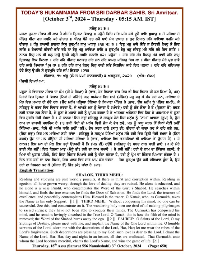 ਸ੍ਰੀ ਦਰਬਾਰ ਸਾਹਿਬ ਤੋਂ ਅੱਜ ਦਾ ਹੁਕਮਨਾਮਾ