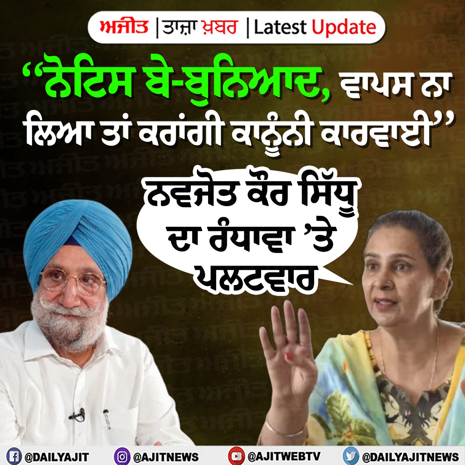 ਨਵਜੋਤ ਕੌਰ ਸਿੱਧੂ ਦਾ ਰੰਧਾਵਾ 'ਤੇ ਪਲਟਵਾਰ: 'ਨੋਟਿਸ ਬੇਬੁਨਿਆਦ, ਵਾਪਸ ਨਾ ਲਿਆ ਤਾਂ ਕਰਾਂਗੀ ਕਾਨੂੰਨੀ ਕਾਰਵਾਈ'