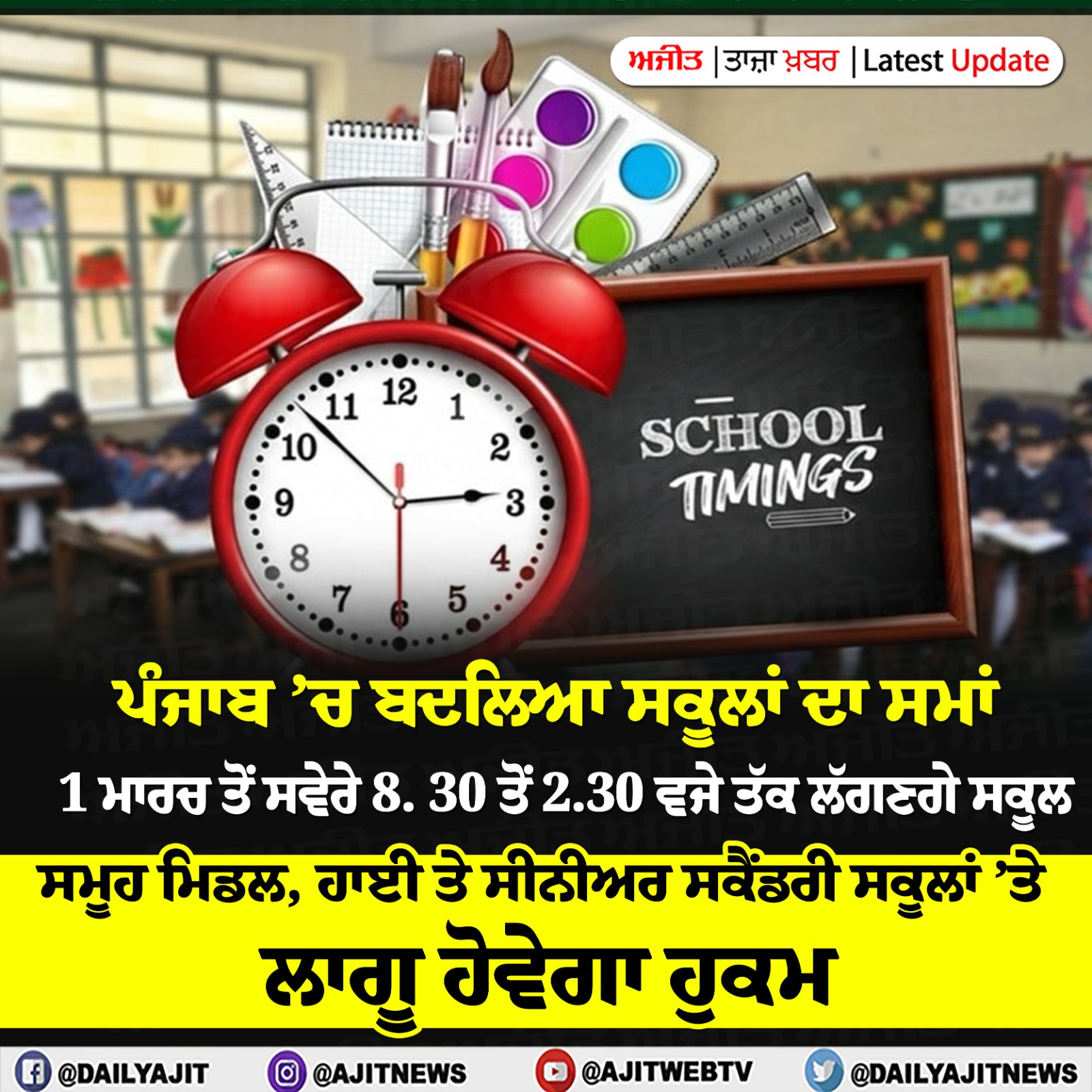 ਚੰਡੀਗੜ੍ਹ, 28 ਫਰਵਰੀ (ਪ੍ਰੋ. ਅਵਤਾਰ ਸਿੰਘ)- ਪੰਜਾਬ ਸਰਕਾਰ ਦੇ ਸਿੱਖਿਆ ਵਿਭਾਗ ਵਲੋਂ ਜਾਰੀ ਇਕ ਹੁਕਮ ਮੁਤਾਬਕ ਸੂਬੇ ਦੇ ਸਮੂਹ ਸਰਕਾਰੀ, ਪ੍ਰਾਈਵੇਟ ਏਡਡ ਅਤੇ ਮਾਨਤਾ ਪ੍ਰਾਪਤ ਸਮੂਹ ਪ੍ਰਾਇਮਰੀ....