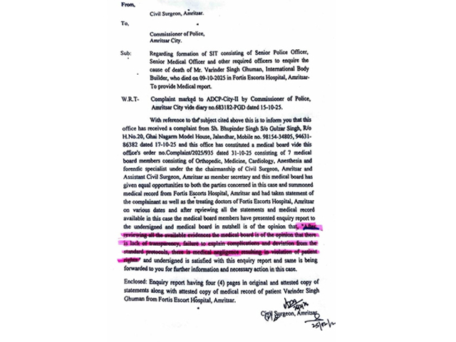 ਜਲੰਧਰ, 2 ਮਾਰਚ- ਪੰਜਾਬ ਦੇ ਜਲੰਧਰ ਦੇ ਰਹਿਣ ਵਾਲੇ ਮਸ਼ਹੂਰ ਬਾਡੀ ਬਿਲਡਰ ਵਰਿੰਦਰ ਸਿੰਘ ਘੁੰਮਣ ਦੀ 9 ਅਕਤੂਬਰ ਨੂੰ ਅੰਮ੍ਰਿਤਸਰ ਦੇ ਫੋਰਟਿਸ ਹਸਪਤਾਲ ਵਿਚ ਇਕ ਆਪ੍ਰੇਸ਼ਨ ਦੌਰਾਨ ਮੌਤ ਹੋ ਗਈ ਸੀ। ਹਸਪਤਾਲ ਨੇ ਇਕ ਬੁਲੇਟਿਨ ਜਾਰੀ ਕੀਤਾ ਸੀ, ਜਿਸ ਵਿਚ ਕਿਹਾ ਗਿਆ ਸੀ ਕਿ ਉਨ੍ਹਾਂ ਦੀ ਮੌਤ ਦਿਲ ਦਾ ਦੌਰਾ ਪੈਣ ਕਾਰਨ ਹੋਈ। ਹਾਲਾਂਕਿ ਪਰਿਵਾਰ ਨੇ ਅੰਮ੍ਰਿਤਸਰ ਦੇ ਡੀ.ਸੀ. ਕੋਲ ਸ਼ਿਕਾਇਤ ਦਰਜ ਕਰਵਾਈ ਸੀ, ਜਿਸ ਵਿਚ ਮਾਮਲੇ ਦੀ ਜਾਂਚ ਦੀ ਬੇਨਤੀ ਕੀਤੀ ਗਈ ਸੀ ਅਤੇ ਡੀ.ਸੀ. ਨੇ ਇਕ ਮੈਡੀਕਲ ਅਫਸਰ ਅਤੇ ਡਾਕਟਰਾਂ ਦੇ ਪੈਨਲ ਨੂੰ ਮਾਮਲੇ ਦੀ ਜਾਂਚ ਕਰਨ ਦਾ ਆਦੇਸ਼ ਦਿੱਤਾ ਸੀ। 7 ਡਾਕਟਰਾਂ ਦੇ ਪੈਨਲ ਦੀ ਰਿਪੋਰਟ ਹੁਣ ਜਾਰੀ ਕੀਤੀ ਗਈ ਹੈ, ਜਿਸ ਵਿਚ ਹਸਪਤਾਲ ਪ੍ਰਬੰਧਨ ਅਤੇ ਡਾਕਟਰਾਂ ਦੀ ਲਾਪਰਵਾਹੀ ਕਾਰਨ ਵਰਿੰਦਰ ਸਿੰਘ ਘੁੰਮਣ ਦੀ ਮੌਤ ਬਾਰੇ ਸੱਚਾਈ ਸਾਹਮਣੇ ਆਈ ਹੈ।