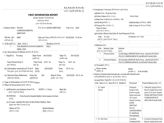 ਰਿਪੋਰਟ ’ਚ ਸਪੱਸ਼ਟ ਤੌਰ 'ਤੇ ਕਿਹਾ ਗਿਆ ਸੀ ਕਿ ਵਰਿੰਦਰ ਘੁੰਮਣ ਦੀ ਮੌਤ ਹਸਪਤਾਲ ’ਚ ਸਰਜੀਕਲ ਪ੍ਰਕਿਰਿਆ ਦੌਰਾਨ ਡਾਕਟਰਾਂ ਦੀ ਲਾਪਰਵਾਹੀ ਕਾਰਨ ਹੋਈ ਸੀ। ਇਸ ਮਾਮਲੇ ਦੇ ਸੰਬੰਧ ’ਚ ਅੰਮ੍ਰਿਤਸਰ ਪੁਲਿਸ ਨੇ ਬੀਐਨਐਸ (ਭਾਰਤੀ ਨਾਗਰਿਕ ਸੁਰੱਖਿਆ ਸੰਹਿਤਾ) ਦੀ ਧਾਰਾ 106(1) ਤਹਿਤ ਫੋਰਟਿਸ ਐਸਕਾਰਟ ਹਸਪਤਾਲ ਦੇ 4 ਸੀਨੀਅਰ ਡਾਕਟਰਾਂ ਵਿਰੁੱਧ ਲਾਪਰਵਾਹੀ ਦੇ ਦੋਸ਼ਾਂ ਤਹਿਤ ਕੇਸ ਦਰਜ ਕੀਤਾ ਹੈ। ਪੁਲਿਸ ਵਲੋਂ ਦਰਜ ਕੀਤੀ ਗਈ ਐਫ.ਆਈ.ਆਰ. ਵਿਚ ਡਾ. ਤਾਪਿਸ਼ ਸ਼ੁਕਲਾ (ਆਰਥੋਪੈਡਿਕ ਸਰਜਨ), ਡਾ. ਅਲਕਾ ਤਿਵਾੜੀ (ਕੰਸਲਟੈਂਟ ਅਨੱਸਥੀਸੀਆ), ਡਾ. ਰਾਜੇਂਦਰ ਕੌਰ (ਅਨੱਸਥੀਸੀਆ ਵਿਭਾਗ ਦੇ ਮੁਖੀ) ਅਤੇ ਡਾ. ਅਰੁਣ ਕੁਮਾਰ ਚੋਪੜਾ (ਕਾਰਡੀਓਲੋਜੀ ਵਿਭਾਗ ਵਿਚ ਸਲਾਹਕਾਰ) ਸਾਰੇ ਫੋਰਟਿਸ ਐਸਕਾਰਟਸ ਹਸਪਤਾਲ ਨਾਲ ਜੁੜੇ - ਨੂੰ ਦੋਸ਼ੀ ਵਜੋਂ ਨਾਮਜ਼ਦ ਕੀਤਾ ਗਿਆ ਹੈ।