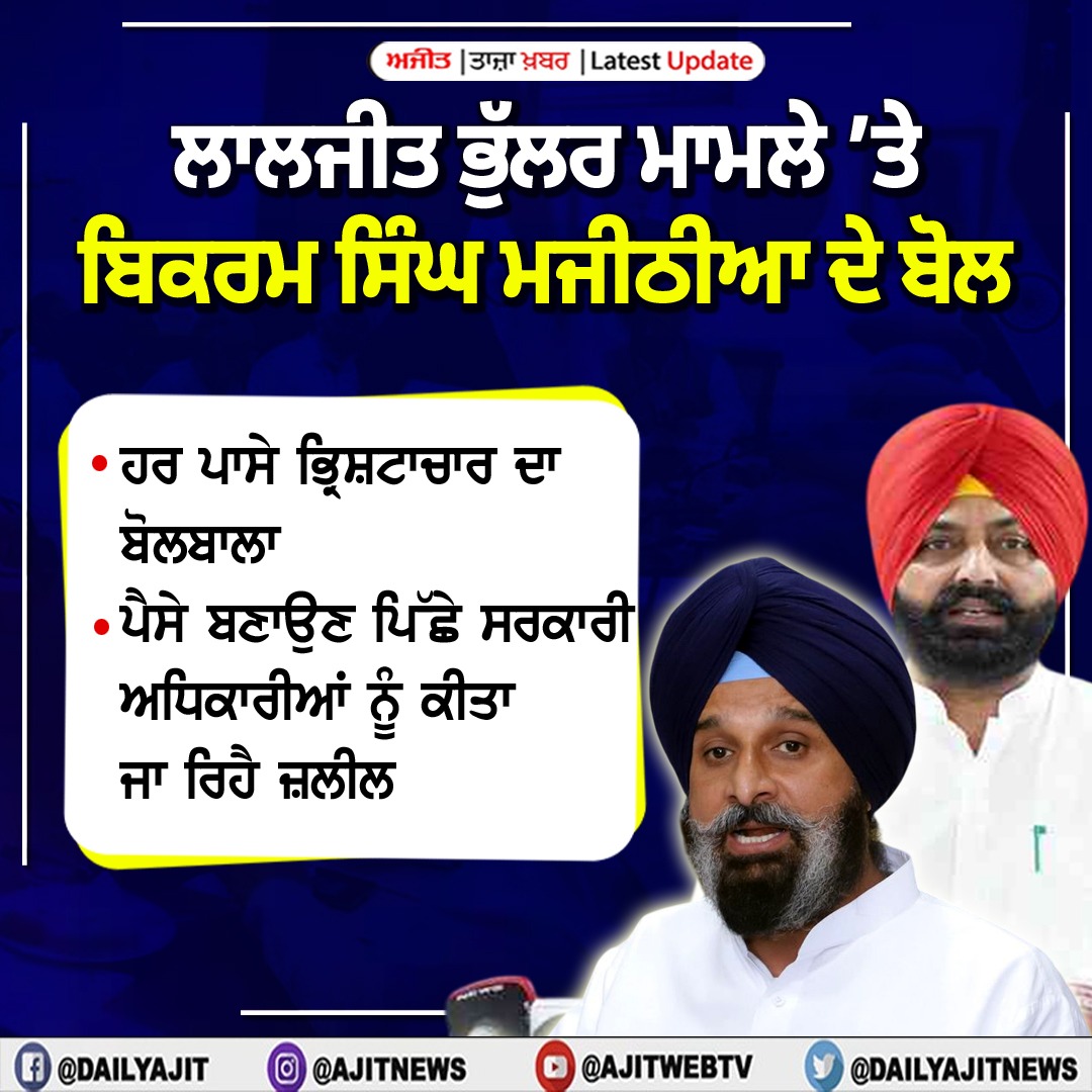 ਚੰਡੀਗੜ੍ਹ, 21 ਮਾਰਚ- ਅੰਮ੍ਰਿਤਸਰ ਵੇਅਰ ਹਾਊਸ ਦੇ ਮੈਨੇਜਰ ਵਲੋਂ ਖੁਦਕੁਸ਼ੀ ਮਾਮਲੇ ਉਤੇ ਅਕਾਲੀ ਦਲ ਦੇ ਸੀਨੀਅਰ ਲੀਡਰ ਬਿਕਰਮ ਸਿੰਘ ਮਜੀਠੀਆ ਦਾ ਟਵੀਟ ਆਇਆ ਹੈ। ਬਿਕਰਮ ਸਿੰਘ ਮ਼ਜੀਠੀਆ ਨੇ ਲਿਖਿਆ ਹੈ ਕਿ ਲਾਲਜੀਤ ਭੁੱਲਰ ਨੇ ਪਿਸਤੌਲ ਦੀ ਨੋਕ ਉਤੇ ਬਣਾਈ ਹੈ ਵੀਡੀਓ ਬਣਾਈ ਕਿ ਉਨ੍ਹਾਂ ਨੇ ਰਿਸ਼ਵਤ ਲਈ ਹੈ। ਵੇਖੋ ਪੂਰਾ ਟਵੀਟ