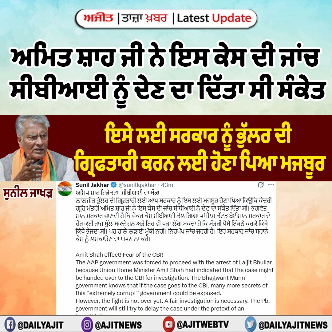 ਚੰਡੀਗੜ੍ਹ, 23 ਮਾਰਚ- ਲਾਲਜੀਤ ਭੁੱਲਰ ਦੀ ਗ੍ਰਿਫਤਾਰੀ ਨੂੰ ਲੈ ਕੇ ਪੰਜਾਬ ਵਿਧਾਨ ਸਭਾ ਵਿਚ ਵਿਰੋਧੀ ਧਿਰ ਦੇ ਨੇਤਾ ਪ੍ਰਤਾਪ ਸਿੰਘ ਬਾਜਵਾ ਨੇ ਟਵੀਟ ਕਰਕੇ ਲਿਖਿਆ ਹੈ ਕਿ ਲਾਲਜੀਤ ਭੁੱਲਰ ਦੀ ਗ੍ਰਿਫਤਾਰੀ ਪੰਜਾਬੀਆਂ ਤੇ ਕਾਂਗਰਸੀਆਂ ਦੀ ਜਿੱਤ ਹੈ।'ਆਪ' ਨੂੰ ਆਪਣੇ ਉੱਚੇ ਘੋੜੇ ਤੋਂ ਹੇਠਾਂ ਉਤਰਨ ਅਤੇ ਆਪਣੇ ਹੀ ਮੰਤਰੀ ਨੂੰ ਗ੍ਰਿਫ਼ਤਾਰ ਕਰਨ ਲਈ ਮਜਬੂਰ ਕੀਤਾ ਗਿਆ ਹੈ। ਉਨ੍ਹਾਂ ਕਿਹਾ ਕਿ ਮੁੱਖ ਮੰਤਰੀ ਮਾਨ ਫਿਰ ਵੀ ਉਸਨੂੰ ਬਚਾਉਣ ਦੀ ਕੋਸ਼ਿਸ਼ ਕਰੇਗਾ ਪਰ ਅਸੀਂ ਆਪਣੀ ਚੌਕਸੀ ਨੂੰ ਢਿੱਲਾ ਨਹੀਂ ਪੈਣ ਦੇਵਾਂਗੇ।