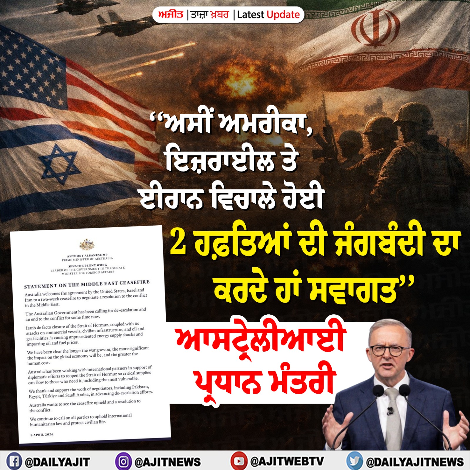 ਦੱਸ ਦੇਈਏ ਕਿ ਅਮਰੀਕਾ ਅਤੇ ਈਰਾਨ ਵਿਚਕਾਰ 40 ਦਿਨਾਂ ਦੀ ਜੰਗ ਤੋਂ ਬਾਅਦ ਦੋ ਹਫ਼ਤਿਆਂ ਦੀ ਜੰਗਬੰਦੀ 'ਤੇ ਆਖਰਕਾਰ ਸਹਿਮਤੀ ਬਣ ਗਈ ਹੈ। ਅਮਰੀਕੀ ਰਾਸ਼ਟਰਪਤੀ ਡੋਨਾਲਡ ਟਰੰਪ ਨੇ ਕਿਹਾ ਕਿ ਇਹ ਫ਼ੈਸਲਾ ਪਾਕਿਸਤਾਨ ਦੇ ਪ੍ਰਧਾਨ ਮੰਤਰੀ ਸ਼ਾਹਬਾਜ਼ ਸ਼ਰੀਫ ਅਤੇ ਫੌਜ ਮੁਖੀ ਦੀਆਂ ਅਪੀਲਾਂ ਤੋਂ ਬਾਅਦ ਕੀਤਾ ਗਿਆ ਹੈ।